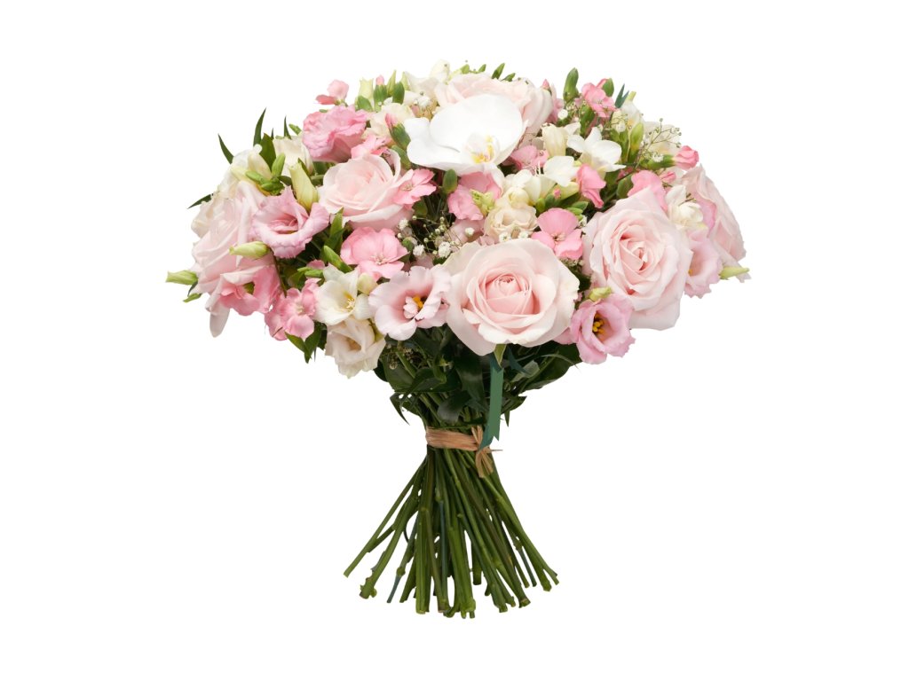 5 růží, 10 frézií, 10 floxů, 4 lisianthy, 1 baby's breath, 1 květinka orchideje. Výška: přibližně 30 cm. Průměr: přibližně 30 cm.